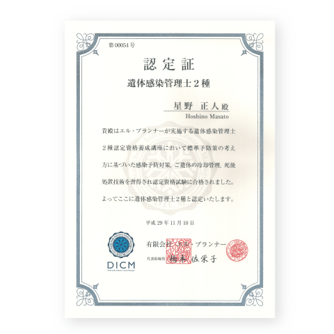 「遺体感染管理士2種」とは、ご遺体からご遺族様への感染を防ぐために、安全な死後処置を行う専門家です。ご遺体の尊厳を遵守すると共に、感染症が判明している場合などは、ご遺族様の不安を取り除き、安心して最後のお別れができるよう、葬儀までの間、継続的にケアを実施いたします。